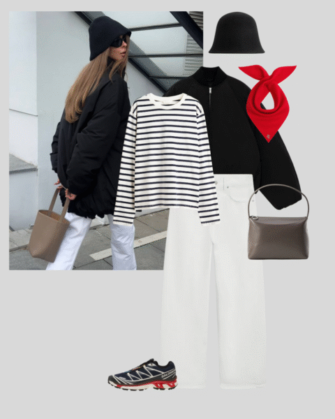Wszystko w połączeniu z klasycznym topem w paski i białymi jeansami.