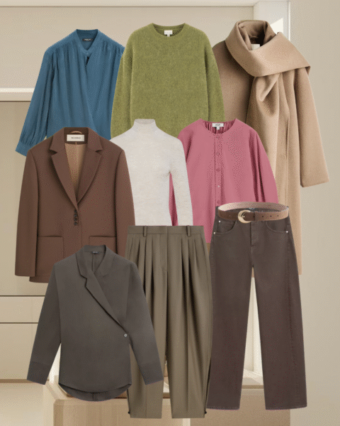 Koszula, sweter oliwkowy, płaszcz, marynarka, golf, koszula, bluzka koszula, spodnie, jeansy, pasek.